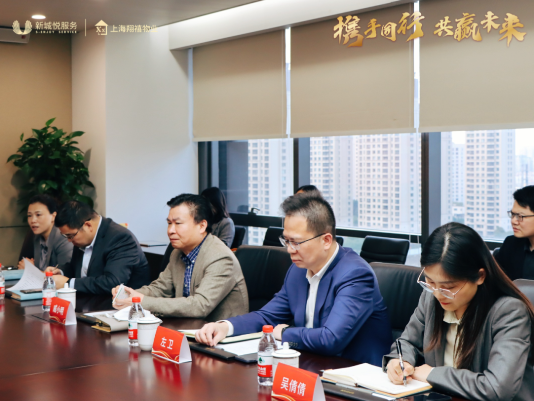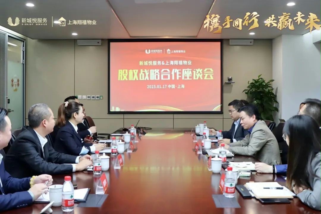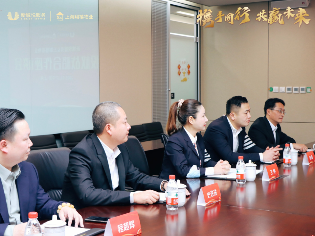 上海翔禧物业董事长王婷、新城悦服务董事长兼首席执行官戚小明及双方多位高管代表出席战略合作签约座谈会议。