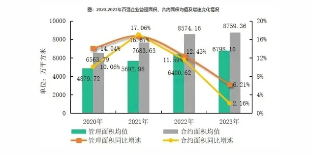 从全国角度看,2023年百强企业管理面积均值为6798.10万平方米,同比增长6.21%,增速较上年下降6.22个百分点,近5年来首次低于10%;合约面积均值为8759.36万平方米,同比增长2.16%,增速较上年下降9.43个百分点。管理面积保持增长主要得益于两个方面,第一,2023年保交楼成效显著,关联方项目供给成为管理面积增量的重要来源;第二,百强企业通过市场竞标、合资合作等方式开展市场化外拓,取得良好成效。尽管当下的管理面积增速在放缓,但依旧是稳中向好的态势,随着地产行业利好频出,也会给物业行业带来更高的增速。