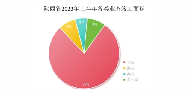 在陕西省的层面上,近5年陕西省房屋建筑竣工面积基本稳定,数值在0.7亿平方米/年上下小幅波动,2023年上半年竣工面积达到2965.39万平方米,同比大幅增长19.1%。其中,住宅类房屋建筑竣工面积远高于其他业态,合计约2.55亿平方米;其次为商业类房屋建筑竣工面积,以0.26亿平方米位居第二;办公类约为0.18亿平方米;学校、科研、医疗等业态房屋建筑竣工面积合计约为0.28亿平方米。未来,随着物业管理范畴不断扩大,建筑业竣工面积有望转化为物业管理面积,住宅仍然是未来物业的主旋律,预计未来5年陕西省物业管理规模有望增加超3亿平方米。