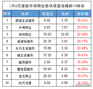 受此利好影响,01月06日,截止收盘,共有21只A+H物业股涨幅在10%之上,42支股票总市值大涨842.8亿元。下表是当日收盘时个股涨幅排名前十的物业股: