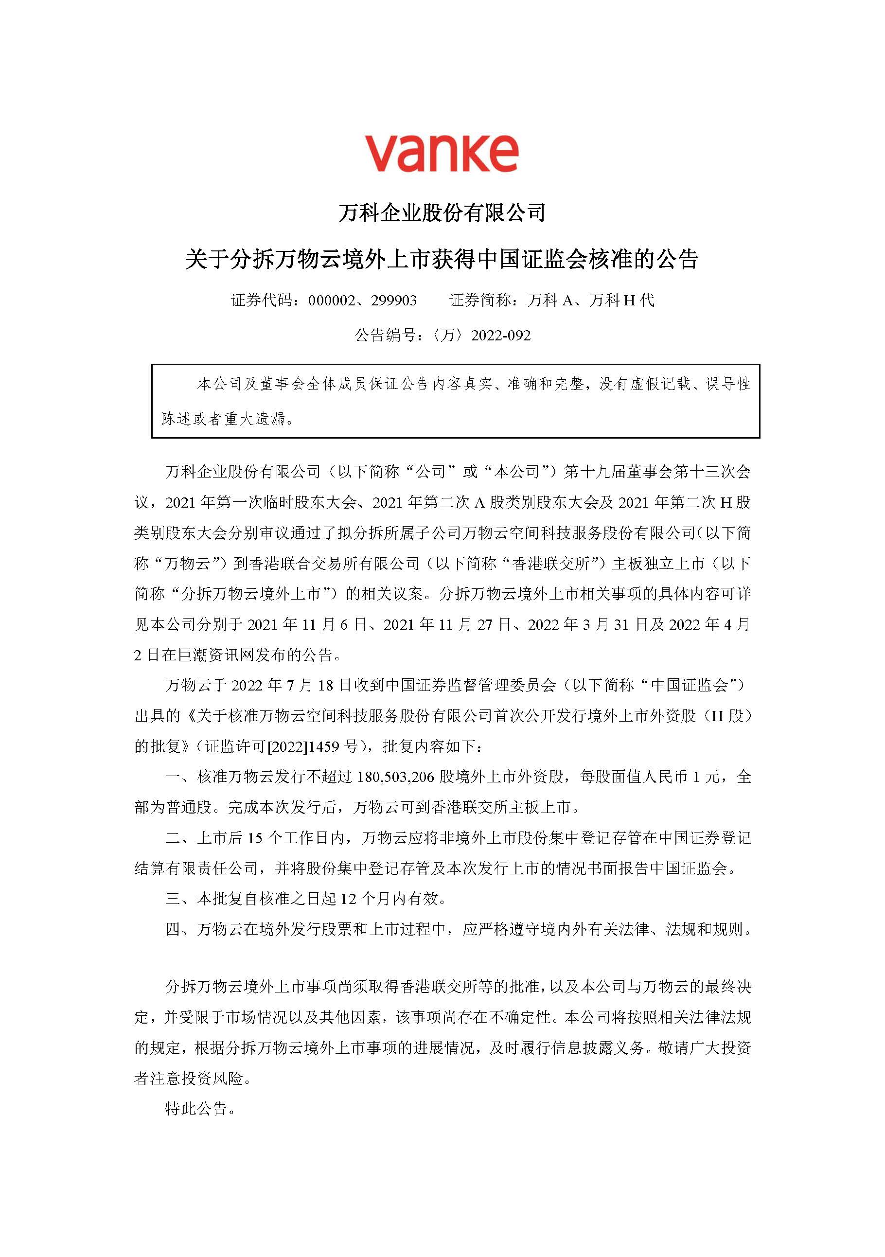 7月18日晚间,万科企业公告称,今日收到中国证券监督管理委员会(下称“中国证监会”)出具的《关于核准万物云空间科技服务股份有限公司首次公开发行境外上市外资股(H股)的批复》(证监许可[2022]1459号),万物云发行不超过180,503,206股境外上市外资股已被核准,每股普通股面值为人民币1元。
