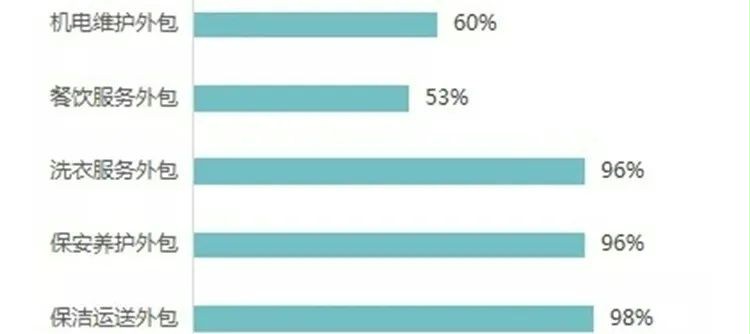 根据调研,目前医院物业服务满意度较高,其中,保洁运送外包满意度98%、保安养护外包满意度96%、洗衣服务外包满意度96%。这为医院接受更多的非医疗服务外包打下基础。