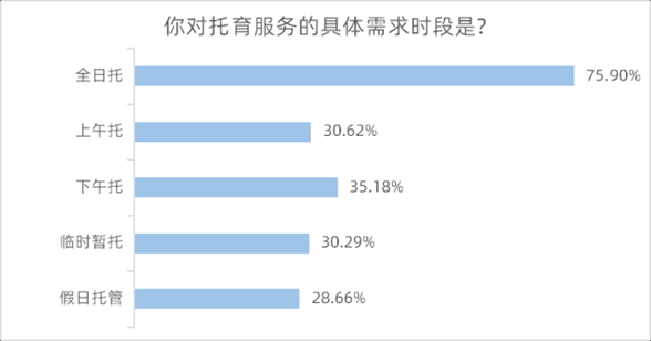 本次调查中,问及受访家长对托育服务的具体需求时段,75.90%表示需要全日托管,35.18%需要下午托,30.62%需要上午托,30.29%需要临时暂托,28.66%需要假日托管。