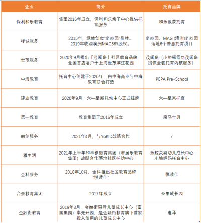 从品牌来看,除融创服务介入比较晚之外,采取和独立托育品牌合作发展外,其余10家均已经发布自己的托育品牌。