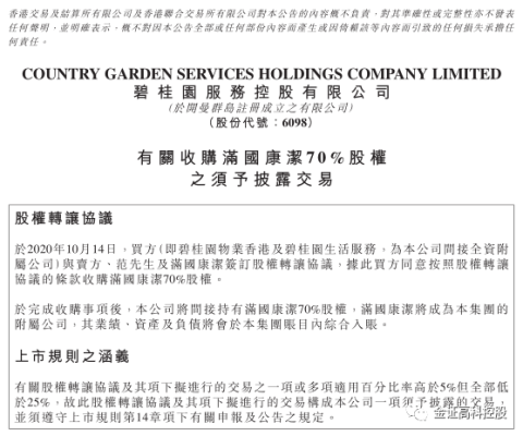 2020年10月14日晚间,碧桂园服务控股有限公司公告称,于当日,公司间接全资附属公司碧桂园物业香港及碧桂园生活服务(买方)与木荣资本有限公司(第一卖方)、湖州育鑫企业管理合伙企业(有限合伙)(第二卖方)、湖州睿隆企业管理合伙企业(有限合伙)(第三卖方)、湖州益鑫企业管理合伙企业(有限合伙)(第四卖方)(统称:卖方)、范满国及满国康洁签订股权转让协议,据此买方同意按照股权转让协议的条款收购满国康洁70%股权,最高代价为不多于24.5亿元。
