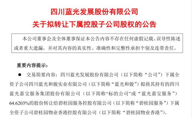 2月25日晚间,蓝光发展发布公告,拟将其全资子公司持有的蓝光嘉宝服务64.6203%的股份转让给碧桂园服务,本次交易对价总代价暂估为48.465亿元。