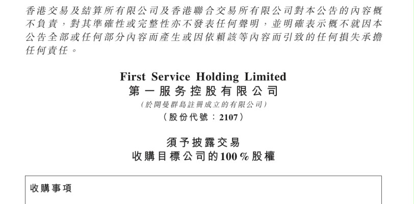 第一服务拟1.36亿元收购山东上诚物业100%股权